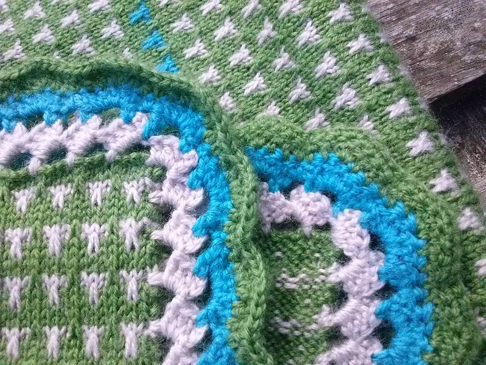 Ik sloeg een voorraad kleuren van Katia Promo Fin in waarvan ik dacht dat ze bij de uitzet zouden passen en ging met proeflapjes aan de slag. Aanvankelijk volgde ik het principe van het patroon, daar word in elke nieuwe baan de voorgaande accentkleur hoofdkleur. Leuk om zo te spelen met kleurtjes en te zien hoe sommige kleuren lijken te veranderen in combinatie met een andere kleur. Anderzijds: ik en kleuren...ik vind het iets moeilijk, en ik bleef me vastpinnen op de kleuren van de uitzet. Dus ik speelde op heel veilig en koos gewoon de kleuren van de uitzet: groene achtergrond met ecru als accentkleur, waarbij het ecru elke 11de accentrij werd vervangen door blauw. (In de uitzet zit een piepklein blauw ruitje tussen de ecru 'dingetjes'.)
